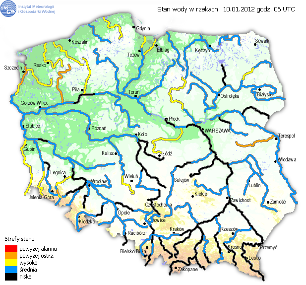 Stan wody (10.01.2012) w dorzeczu Wisły układa się w strefie wody niskiej i średniej. Stan wysoki obserwowano w ujściowym odcinku Wisły, na Krznie i Bzurze oraz lokalnie na Biebrzy i Wkrze. Stan niski obserwowano na górnej i środkowej Wiśle, na większości dopływów górnej Wisły, na Radomce, Pisie i Nurcu oraz lokalnie na Pilicy i Liwcu.